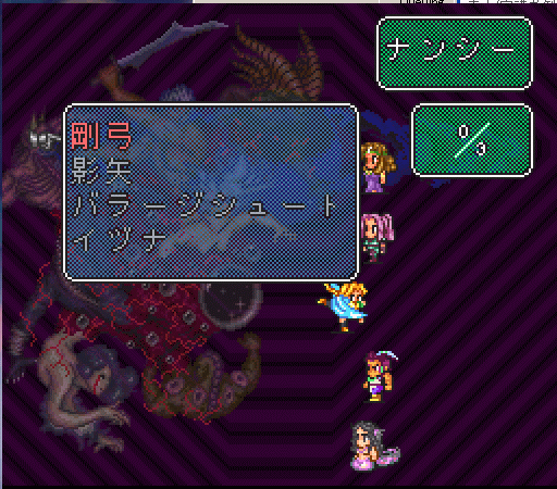 そんな中、不運だったのはカマイタチが連打で来たこと。カマイタチはミサイルガードでかわせるが、エリクサーを全員に装備させているからそれは無理。ここでのカマイタチ連打は痛かった。体力のないガラテイア当たりが死亡する。ラピッドストリームが崩れるとつらく、先制攻撃を食らうわ、ダメージは大きいわ。エリクサーしようとしたキャラが死ぬこと多数。