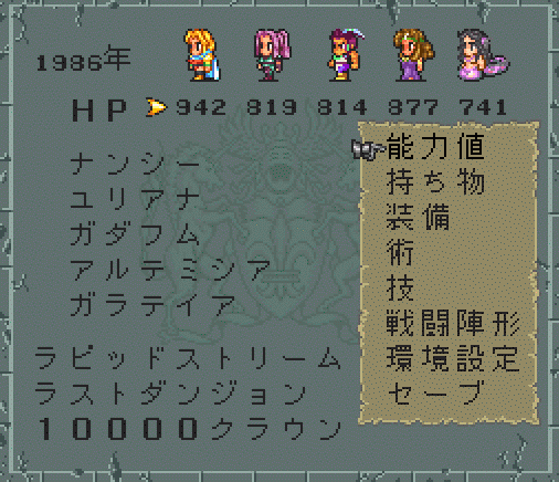 勢ぞろいの後に怖いのはなんといってもメイルシュトローム。スービエが使うのとまるで異なる威力でパーティを襲う。しかしここはネレイドのガラテイアが効いた。メイルシュトローム後の回復は彼女に一手に任せる。ちなみにスービエ、触手も異様に強い。単体では弱いけど合体すると強いチキンな七英雄である。