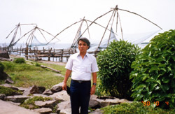 | 現地の人たちと交流するMoさん | チャイニーズ・フィッシング・ネット コーチン独特の漁法。 四つ手網のデカイやつです |