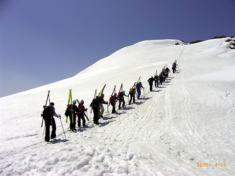 姥ヶ岳と湯殿山の鞍部からスキーを担いでツボ足で登る(11時19分)