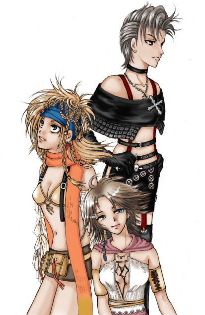 FFX−2の三人娘。 兼ねてから女の子をトップに持ってきたいとは考えていたものの、やっぱりティ受けサイトだからなぁとモンモンとしておりました。 ですがFFの続編が出るということ。そして今回はユウナが主役とのことで、これは良いチャンスとばかりに嬉々として描いたもの。 これを逃したらこれから先、女の子をトップにもってくるのは難しいと思ったから。 やっぱり女の子は描いていて楽しいです。 衣装とかが派手でいいよね。 …でもね、アクセサリーとかが細かくて面倒だったよ。 特にパイン。シンプルなようで手間がかかりました。 あとリュックの髪型とかね。 |