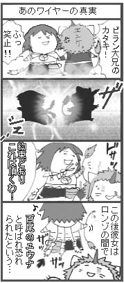 「虹色天球」のおかむに様からの相互リンク記念の有り難ーい頂き物でございます。 そもそもの事のなれそめは、おかむに様のサイトの掲示板でユウナの新コスチュームの後ろの尻尾みたいのはなんぞや?というところから話が展開したのであります。 最初はキマリの毛?というところから始まり、それは色が違うからじゃあロンゾのビラン?となり、つい私が調子に乗って「ロンゾと一騎打ちの末、勝ったユウナが戦利品として尻尾を背中に増やしていく」と言ったところ、それに乗ってくださったおかむに様が漫画にしてくださいました。 いやもう、ただの雑談がこんな楽しい漫画になるのだから、さすがおかむに様。 丸顔のユウナ、ナイス! 「百尾のユウナ」なんて、たまんない。 おかむに様、素敵よ! ああ、こんな楽しい漫画が頂けるなんて、サイトやっててホントよかった。 |