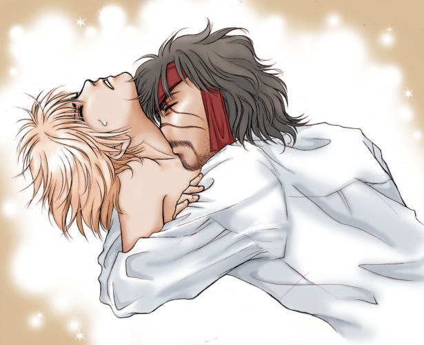 「桜色協奏曲」の櫻様から頂いた小説の挿し絵、第二段。 男の子に戻ったティーダをジェクトが襲っている場面。 最初はキスさせようか、もしくは押し倒している場面にしようか 迷いに迷い…何と三回も描き直した曰く付きの絵。 何に迷ったのか、描き終わった瞬間忘れてしまった。 ティーダが服を着てないのは…本文を見て貰えれば分かる…と思います。 …一応、ジェクトに脱がされたと思ってくれれば幸い。 BACK