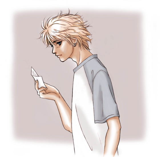 小説の挿し絵用のティーダ。メモを読んでいる場面です。 横顔を描くのは好きです。きりっとした鼻筋の通った横顔って、好みなのですよ。 それに真正面って、描くの難しいから。バランスを取るのがね。 凛とした涼しい横顔の人って、憧れますわ。 しかし…うちのティーダはTシャツばっか着ているなぁ〜。 たまにはもっと、凝った洋服とか着せなきゃいけないんだろうなぁ。 ついつい裸ばっか描いてるからだな。←反省 BACK