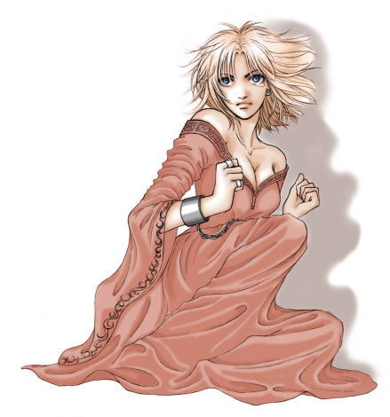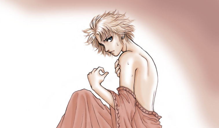 ああ、すごい色だ。真紅の瞳なんだ。こんな色は見たことがない・・・な。 「おいおい、聞いてッかー?ったく・・・。度胸がいいっつーか・・・。」 うっかり見詰めて殆ど聞き逃していた。 「え・・・?あ・・・何がだよ。」 そういえば名前がどうのって言ってたような。 「名前を聞くときは普通、訪ねたほうから名乗るもんだろ?」 更に寄ってくる男の手がスカートを抑えるように上に置かれた。 「本当に威勢がいいな。どう見たってイイトコのお嬢さんが何だってそんなに男言葉なんだよ。・・・まーいいか。後でじっくり聞くとして…。」 にやり、と笑った。 「俺の名前はジェクトだ。よーく覚えとけ。」 ああいった手前、名乗らない訳にもいかず。 「オレ・・・は・・・ティー・・・ア。」 「・・・俺ェ?・・・そんなナリしといて実は男でした、なんてくっだらねぇオチは付いてねぇだろうな。」 またやった、と思うが既に言葉は口から滑り出た後。しかもジェクトの言葉も遠からず真実を言い当てている。見た目はともかく実際は男な訳で。 「そうだよ。オレ・・・ホントに男だし。」 「面白ぇこと言うじゃねぇか。いいぜ、実際確かめるからよ。」 どうやって?と尋ねようとしたところへ、少し頭を傾けてジェクトが口付けた。瞬間何が起きたか見当もつかず、大きく目を見開くだけしか出来なかった。 我に返り、慌てて広い胸を押し返そうにもこんな細い腕では何の役にも立たず、蹴り上げてやろうにも抑えられたスカートに阻まれて足も満足に動かせない。 ![]() 更に背中には壁。 せめて懸命に歯を食いしばり、唇を真一文字に結ぶくらいしか出来ない。 こうなれば隙を見て、手枷で思いっきりぶん殴ってやる! ジェクトの手が服の上からふくよかな胸に触れてきた。 途端にぞわり、と総毛立ち、隙を狙うどころではない。 懸命に頭を振り、何とか口付けから逃れ。ただ闇雲に手を振り回し嫌悪の声を上げる。 「やッ・・・だっ!触るなぁっ!」 その手に倣う鎖がジェクトの頬を掠め、ほんの僅か怯んだ瞬間に脇を抜けようとした。 「・・・ってーな。まあ待てよ。そう慌てて逃げても仕方がねぇぜ。」 言うが早いか。ジェクトの手は素早く鎖を掴み、真上に引き上げた。無理矢理に引かれた肩が鋭い痛みを訴える。 「いっ・・・つ・・・放せ!放せよ!」 ティーダも抵抗を止めない。少々の痛みにも目を瞑り、何とか外れないものかともがく。 ふぅ、と溜め息を付いてジェクトは腰に差したナイフを取り出し。振り被って壁が震えるほど力任せに刃を突き立てた。 その大きな音に怯んだティーダの動きが止まった瞬間を逃さず、上向きに柄まで埋まったナイフに鎖を引っ掛けた。 背中には壁があたり、膝はやっとつける状態で吊り下げられ、今度こそ逃げの手段を全て奪われる。 「そう怯えるなって。別に殺そうとか思ってねぇんだからよ。」 呆れ半分に笑うジェクトは変わらず人好きのする笑顔を見せた。それでも再び触れようと伸びてくる手には恐怖しか感じず。 「ヤダっつってんだろ!」 身を捩っても鎖は外れない。 ジェクトの手が頬に触れそのまま滑り、お気に入りのピアスに触れた。肩がぴくりと震える。 耳の形を指でなぞられ、黄金の髪を掻き分け首筋へと降りる。ゆっくりと動く指がくすぐったくて、それでも怖くて。きつく目を閉じて身を硬くすることしか出来ない。 襟元の開いたドレスから覗く鎖骨を指一本で撫でられた時に、大きく体が揺れた。何度か行き来する指が離れたかと思うと濡れた生暖かい何かが代わりに滑った。 「んっ・・・。」 舐められたんだ、と頭で理解するよりも先に声が零れた。その声が妙に気恥ずかしくて唇をかみ締めてしまう。 「可愛い声を聞かせろや。」 「うっさ・・・いっ!」 片手で細い腰を抱き寄せ体を密着させ、胸元に置かれた大きな手はふくらみを布越しに包んだ。 柔らかく持ち上げるように揉まれて、今までに感じたことのない甘い感覚がざわめくように湧き上がる。 体は逃げたいのにジェクトの腕に抱き寄せられていて。ただ、頭を弱く振るしかなかった。何とかこの感覚から逃れたい。 少しずつ動悸が酷くなって、呼気が乱れてしまう。 そうすると抑えようのない声まで一緒に溢れてしまって、自分の声にどうしようもない羞恥に苛まれた。 「いっ・・・や・・・くっ」 俯いて耐えるティーダの露になったうなじに唇を落とし、音をたてて吸う。 「うあっ・・・んくっ・・・。」 密着した体はジェクトが声を殺して笑っているのが伝わる。それが悔しい。 「声を詰めてる方が苦しいぜ。」 腰を抱いていた手が離れ、つ、と噛み締められた唇に触れる。ティーダは反射的にその指に噛み付いた。 「っつ!・・・いってーなぁ。元気がいいのは認めたっつってんじゃねーか。そろそろ大人しくしようとか思わねぇか?」 皮膚が破れて血が滲んだ指をぺろりと舐め。やれやれ、と大仰に溜め息をついてみせる。 「触らなきゃ・・・大人しく、