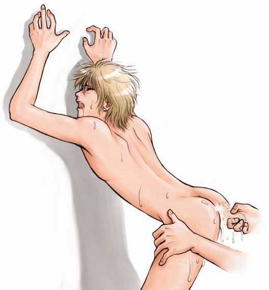 腰が揺れる。 喘ぎ声が止まらない。 後ろに男のモノをくわえ込まされて、揺さぶられる。 壁に手をつかされて、尻を男の目の前に突き出しているこの淫らな格好を思い描くだけで恥ずかしさに居たたまれなくなるほどだ。 それなのに…男を拒めない自分がいた。 恥ずかしいのに、体が彼を求めている。 体中を舐め回され、手で、指で、舌で感じさせられた。 前をまさぐられたときは、無意識の内に「もっと…」と強請ってしまったくらいだった。 こんな淫らな自分なんて知らない。 後孔で男をくわえ込むことすらも、最初は辛いだけだったのに、今は堪らないくらいの快感になってしまっている自分がいる。 指だけじゃ足りない。 もっと熱くて、堅い彼自身が欲しかった。 それを自分の中に突き立てて、中を抉って欲しいのだ。 「どうした?随分、よさそうじゃねぇか。そんなにいいんか?」 男の笑みを含んだ声が聞こえてくる。 「う…るさい」 「相変わらず、口だけは達者だよな。お前はよ」 そうティーダの耳元で囁き、彼がぐっと中へ自分自身を突き立て、ティーダの感じる場所を抉ってくる。 「う…あぁぁぁ!」 思わず声を上げてしまう。 「なんだかんだ言っても、コレがいいんだろう?俺のコレをくわえ込んで、嬉しがって絡みついてきやがる」 そう言うなり、男がティーダの腰を抱え上げてより深く中にまで入り込んでくる。 「い…やぁ!もう…駄目。そんな…深くまで入んない」 「嘘付け。だったら何でお前の前がこうなってんだ?ビンビンに押っ立ててるくせによ」 彼の手がティーダの中心を握りこみ、しごき上げてくる。 既に後ろだけで存分に感じさせられ過ぎている身には、辛すぎる感覚だ。 「や…。苦し…。もう…もうイって…。出して…」 内臓を抉られる苦しみではなかった。 これは快感。 快感が強すぎて、逆に辛いのだ。 何度も何度も突き上げられた。イきそうになるたびに逸らされて、また限界にまで高められるのだ。 それを続けさせられた。 それは甘い罰。 快感という名の苦しみ。 「ジェクト…もう許して…」 涙に潤んだ瞳を向けて、ティーダが自分を貪る男の目を見やる。 ふっとジェクトが笑みをもらす。 そして濡れた手をそっとティーダの胸に這わせ、彼の乳首を摘み上げた。 「あ…んっ…」 ティーダの喉が仰け反る。 「いいやまだだ。これくらいで許してたら、お仕置きにはならねぇだろう?目一杯感じて、俺の下でよがれよ。もっと淫らに俺を欲しがるんだな。俺を欲しがって、俺だけを見て、感じろ。いいか、覚えてろよ。お前の此処は俺をくわえ込む為にあるってことをしっかり感じるんだな」 そう言って、ジェクトが再度ティーダの中を突いてくる。 「あ…あぁ!や…ぁ!」 強い快感が辛すぎる。 自分を求めるジェクトの執着心に溺れてしまいそう。 辛くて苦しいのに、腰を振っている自分を知っている。 止めてと言いながら、前を握りこまれると先端から蜜が溢れ出しているのが分かる。 自分の中を穿つジェクト自身を、喜んで貪っている内部。 止めてと言いながら、男のモノを欲しがっている。 淫らだと思う。 自分が。 そして…彼も。 淫らに貪り合う自分達二人がだ。 「ジェクト…もっと…突いて…」 我知らず漏れた声にジェクトが喉を鳴らしたのが聞こえた。 「可愛いぜ。お前って奴はよ」 再度、ぐっと中を抉られる。突き上げられる。 「ほら、お前が欲しがっているモノをくれてやる」 「!」 頭の中が白く、霞んでいく。快感が体の全てを支配する。 淫らに堕ちていく………自分をティーダは感じていた。 END |