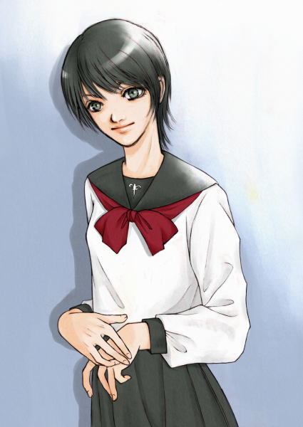 小説「好きまでの距離感」の登場人物の一人です。 彼女の名前は「崎谷かおり」ちゃん。 本文で結構重要な役割ではないのかな〜と。 野間桂一郎君と同じ剣道部に所属しているという設定。 スポーツウーマンという設定なので、あえてショートカットにしてみました。 そしてこの絵の見所はズバリセーラー服! かなり自分的に萌え〜な気分で描いちゃいました。 BACK