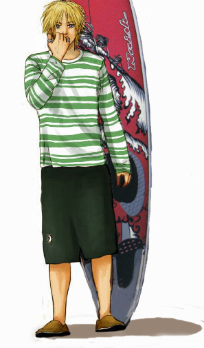7月は夏。 夏はやっぱりこのサイトの立ち上げのきっかけとなった彼の登場です。 そして夏は海。海といったらサーファーでしょうねと言う連想で、このイラストに。 変に格好つけたポーズよりはこんなさりげない絵が好みなので、こうなりました。 久々に彼を描いて、何となくホッとしてしまいました。 好きなキャラは、好きなままなんだなぁと実感しています。 BACK