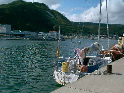 入り口付近の暗岩に気をつけながら14時40分入港。市場で作業していたおっさんに指示され港内の夕陽公園前の岸壁に横付け。