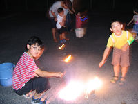 官舎で子どものいる数家族があつまって前庭で花火をしました。人物に合わせてナイトモードで撮っているので火が非常に明るく写っていますが、普通の手持ち花火です。