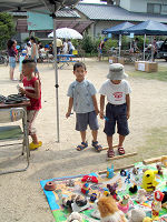教会学校では、毎年行っている夏期学校を、今年は「キッズ夏フェス」と題して、教会員の協力を得て屋台風の出し物(焼きそば、かき氷など)を行いました。もちろん牧師先生のお話や賛美もちゃんとあります。写真は、輪投げでぬいぐるみをゲットするアトラクションに興味津々の全くんです。創くんは半分はスタッフ側でお手伝いをしっかりしてくれました。
