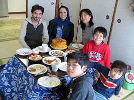 日曜日の礼拝後、おとうさんの研究所に来ている外国人留学生のお宅に招かれて昼食をいただきました。テーブルの真ん中奥にのっている大きなケーキのようなものが本日のメーンディッシュです。鶏肉とライスに卵やポテトをくわえて味付けして焼いたもので、奥様の故郷(イスファハン)の郷土料理だそうです。たいへん美味しく、お腹いっぱいいただきました。