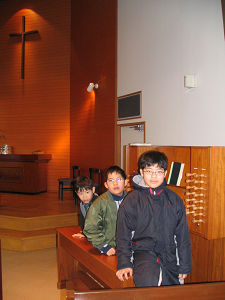 元旦から2週間経ったので、トップページの「謹賀新年」の文字と写真をこちらの写真に更新しました。この写真は茅ヶ崎教会のオルガンに座らせてもらって撮りました。ヤマハ音楽教室やピアノをやっているので3人とも大きなチャーチオルガンにそれなりに興味はあるようでした。