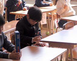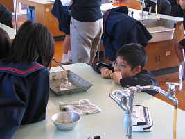 小学校の公開日でした。啓くんのクラスには理科実験の時に訪問しました。金属棒にロウを塗って、一端を加熱してロウの溶け方を観察しているところです。金属の熱伝導の勉強ですね。全くんのクラスには算数の授業中に訪れたのですが、全くんは先生の話を聞かずに教科書に消しゴムをかけていました(右)。本人によると「教科書が鉛筆で汚れていたから」ということですが、それなら休み時間にすべきです。