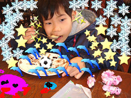 チボリ公園で遊んでバームクーヘンを食べました。撮った写真に自らデコレーションをした全くんです。右はお土産にもらったクマの人形や、お年玉で買ったレゴといっしょに自宅で撮りました。