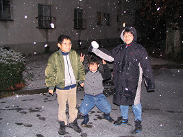 先週の日曜日夜から月曜日にかけて雪が積もって以来、寒い日が続いていました。創くんがつくった雪だるま(こちらの写真の奥、啓くんが傍らに立っているもの)は形は崩れましたが一週間たっても融け残っていました。そんな中、今日は夕方からまた雪が降って積もりはじめました。また明朝に雪だるまを作れそうです。積もるほどの雪が一冬に2回も降るというのは倉敷に住み始めて(1992年)以来はじめてのことです。