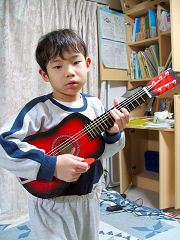 全くんのギターです。手の大きさにフィットしていますね。ちゃんと調弦できる本格的なものですが、音あわせに結構手間がかかっています。おとうさんはギターの調弦がわかるのですが、使い始めは弦の伸びがなかなか安定しないのです。とりあえず大まかに音があったので、Cコードの押さえ方を図に描いて教えてあげました。でもまだコードどころか、全くんにはまず弦がしっかり押さえられません。最初はそんなもんですけどね。全くんの目標は、ゆずの「またあえる日まで」を弾くことです。