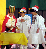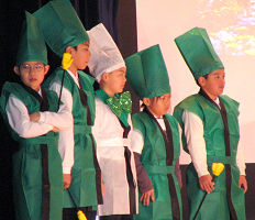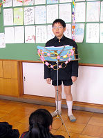 小学校では学芸発表会でした。全くんはニワトリの役です(左)。たいへん元気に演じていました。ニワトリは以前、創くんもやった役です。4年生は音楽劇「オズの魔法使い」で啓くんはオズの「右手」ということです。啓くんが「手」をもっていますね。舞台の上での役割は少ないですが、脇で合唱隊で貢献していました。