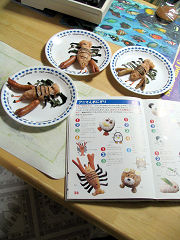 全くんがクッキングの本を借りてきて、おかあさんにアニマルおにぎりを作ってもらいました。啓くんにノリを切らせてザリガニの足を作ってもらいましたが、当の全くんは手を出しません。3人分つくったので、何もしなかった創くんも
