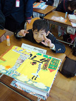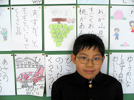 小学校の参観日でした。1年生は1年間の図画作品を1冊にまとめる作業を保護者と一緒にしました。4年生は1/2成人式で、作文を発表しました。壁に貼っているのは子供たちが考えたカルタで、啓くんの作品はマスカットのものです。