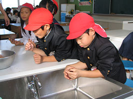 2年生としては初めて家庭科室を使いました。最初に家庭科室使用のルールの説明を聞き、それから先月27日に自分たちで掘ったサツマイモを洗いました。明日はこれを調理してお芋パーティーが予定されています。