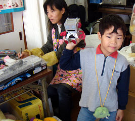 バザー会場ではたくさんオモチャを買い(左)、綿菓子とかいろいろ食べて大満足の全くんです。アッという間に持参金を使い果たしておとうさんからさらに120円借金しました。啓くんはさすがにセーブしながら使ってお小遣いを残していました。