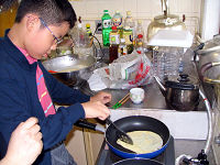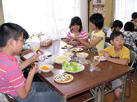 久しぶりの雨でした。中学校の体育会は延期になってしまいました。朝一番に皮膚科で診察してもらった結果、啓くんの湿疹はトビヒではないことがわかり感染の危険はないということで安心しました。軟膏をもらってから、教会のキッズクラブに出かけました。踊り付きで賛美し(左)、メッセージを聞いて(中左)から、各自好きな具を入れてクレープをつくり、美味しくいただきました(中右:全くんが「おいしい」顔をしています)。希望者は生地を焼くのもやらせてもらいました(右)。