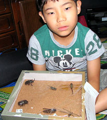 夏休みの自由研究/作品である昆虫採集標本を持って帰ってきた全くんです(左)。標本といってもわずか6頭で、しかもそのうちのトンボはおとうさんが研究所実験農場でつかまえてきたものですが・・・。夕食後はチェスをした全くん、啓くんです。子どもたちは駒の動きは一応わかっています。写真に写っているガラス製のチェスセット(おとうさんが外国人からいただいたもの)を使わせてもらったのは2度目です。見た目はたいへん美しくて、その点は子どもたちも大いに喜んでプレーしているのですが、磨りガラスか透明ガラスか違いで敵味方を区別するというのがわかりにくいとのことでした。