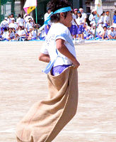 雨のために延期されていた中学校の運動会が開かれました。我が家の長男は障害物競争の第一走者でトップで走りました。写真右は3年生全員によるヨサコイソーランです。