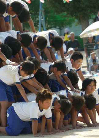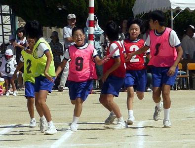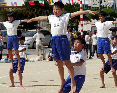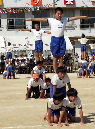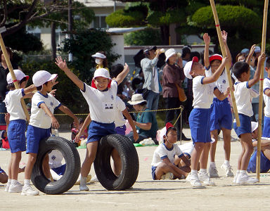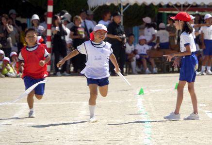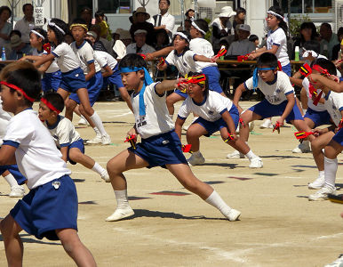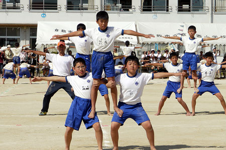 晴天のもと、小学校の運動会が行われました。3年生のリレーでは、第一レースで白チームのアンカーで走った全くんは1位でゴールしました(写真1段目左)。ヨサコイの踊り(演技)もたいへん上手にできました(1段目右)。6年生のリレーでは啓くんは第2走者、1位でバトンをつなぎました(2段目左)。棒引き/タイヤ引きの競技名は「重タイヤー!バー奪取!」です。全くんはタイヤを取ってチームも勝って大喜びです(2段目右)。5,6年生の組み体操(写真3段目、4段目)は練習の成果が反映されて大成功でした。2人技、3人技、4人技と進み、最後の大ピラミッドは7段の大技です。啓くんは2段目を担当でした。競技が全部終了して、結果は194対184で白組の勝利、勝った全くんは級友と抱き合って喜んでいました。ケガもなく、たいへんよい運動会になりました。