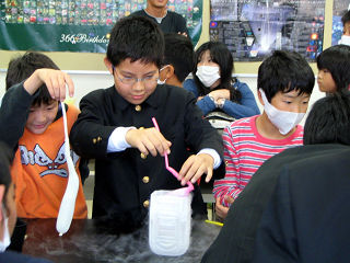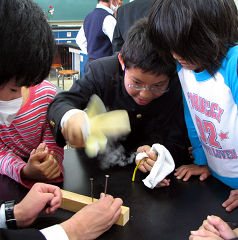 昨日の様子です。上段は天城中学校のサイエンス部でいろいろ楽しい実験をしているところです。風船を液体窒素に入れて中の空気を液化してみたり(上左)、液体窒素でコチコチに固くなったバナナで釘を打ったり(上右)しました。