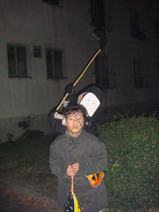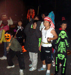 下段左は、帰宅した啓くんが工作で「鎌」を作っているところです。白いお面をして死神に仮装して、作った鎌を振り上げています(下中の写真の後方)。全くんは、フランケンシュタインです。他の子どもたちも、様々趣向を凝らしてハロウィーンを楽しみました(下右)。
