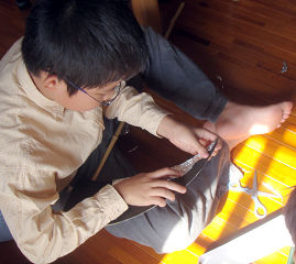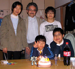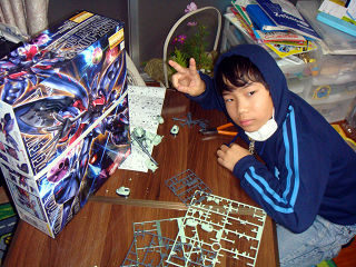 全くんは誕生日プレゼントにもらったガンプラのうち、小さい方は昨日のうちに完成させ(昨日の右写真でテーブルの上に写っています)、今日は大きい方の作成を楽しんでいます。手伝いたくてたまらない啓くんは、宿題など自宅学習を済ませてからだよ、と親から釘を刺されています。