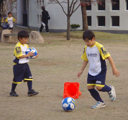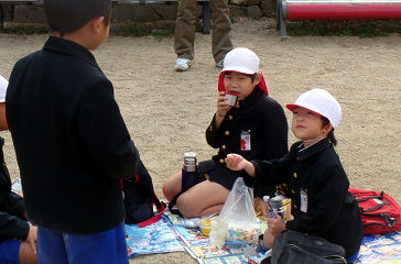 秋の遠足で、岡山市内の子どもの森に出かけてお弁当を食べている全くんです(写真左)。おとうさんが今日の午前中に岡山大学農学部で講義があり、その後にキャンパスから近い子どもの森に様子を見に出かけたのです。夕方はユニフォームを着てサッカーのクラスです(左)。クラス開始前に自由に楽しんでいるところです。