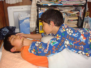 写真は先週金曜夜のものですが、こんな具合で昼寝している啓くんにちょっかいを出す全くんです。あんまりしつこいと、さすがに啓くんも怒り出します。