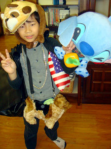 教会バザーでした。中学校は登校日(参観日と入試説明会)のため、今日の教会バザー本編には参加できず、後かたづけに駆けつけました。小学生たちは思い思いにバザーを楽しみました。全くんは、ネックレス、ピンバッジなどのアクセサリー、バック(3つも!)と香水の小瓶、小物・大物(?)のぬいぐるみ、かぶり物などをお小遣いでたくさん買い、着飾って意気揚々です(写真)。