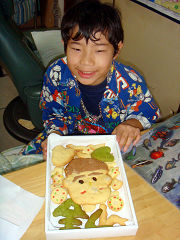 全くんの誕生日です。同じ宿舎にすむ幼なじみのシュウくんたち近藤家から手作りクッキーをプレゼントしてもらいました(左)。我が家からのお誕生日プレゼントは全くんの要望でガンプラです(中)。夕食は回転寿司、帰宅してからアイスケーキでした(右)。