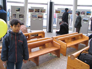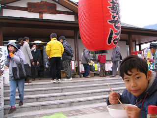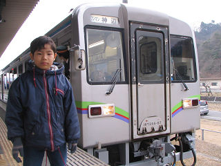 井原鉄道(井原線)におとうさんと全くんで乗りに行きました。距離にかかわらず1乗車100円/人の特別な日(ワンコインデー)でした。この鉄道は平成11年の1月11日に開業ということで、今日は開業11年の記念日なのです。全くんは初めての乗車です。写真中は井原駅で開催中の、沿線の写真展の会場です。駅前広場のフリーマーケットで翼長30cmくらいある大きな雉の剥製を見つけて欲しがった全くんですが、却下されてご機嫌斜めの状態での撮影です。その後、矢掛駅に移動して、こちらのフリーマーケットではカードゲームのレアカードを見つけて買ってもらい、ご機嫌がもどりました。写真右は、矢掛駅前で出店のラーメンを食べているところです。このほか、ワンコインデーと連動した井原駅での100円のおそば、矢掛駅での100円のしし鍋汁もいただいて、お腹いっぱいになりました。
