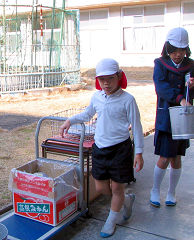 写真は、昨日おかあさんが学校で給食委員を取材した時のものです。今週は全くんがクラスの給食当番で調理室に食器返却に来ていました。