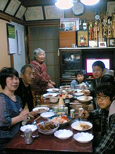 おかあさんと子供たちは、茅ヶ崎に無事到着です。JRの青春18切符をつかって鈍行列車を乗り継ぐ12時間弱の旅ですが、本やゲームを持ち込んで、みんな結構楽しく過ごします。途中で20分くらい乗り換え時間があるときは、立ち食いスタンドによったりしたそうです。そういった食費は別として、交通費としては一人あたり2300円だけで700km以上の距離を移動できます。写真はおばあちゃん宅で夕食の様子です。