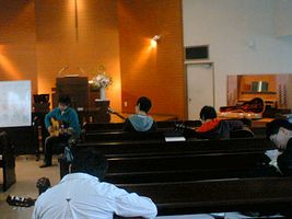 昨日茅ヶ崎の方では、午前中の茅ヶ崎教会のイースター礼拝におかあさん、創、おばあちゃんが出席しました。おばあちゃんが来てくれたのは、とてもうれしいことです。創の誘いがよかったみたいです。創は礼拝に先立って教会学校のギター教室にも出ました(写真)。午後は茅ヶ崎のとなりの藤沢市にて、おかあさんたちOBも出演する、湘南高校吹奏楽部第30回定期演奏会を、おじさん、おばあちゃん、おかあさんの従姉妹のおばちゃん、創とで聴きに行きました。演奏会は大盛況で、こちらもたいへんよかったということです。