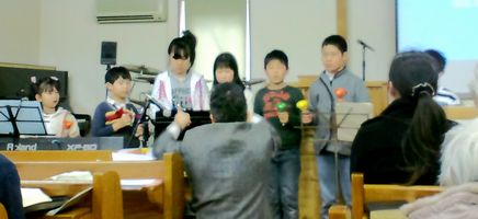 4日のイースターに子供たちが披露したハンドベルの様子です。子供たちはとてもがんばりました。途中からは会衆も賛美に加わってもらいました。
