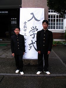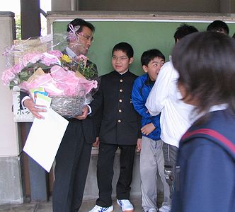 雨の入学式で、今日は特別におとうさんが自動車で送り迎えをしました。明日からは、雨でもカッパ着て自転車通学です。クラスは1年9組で、昔なじみのハシモトくんと一緒になって、たいへんうれしい啓くんでした。午後は、小学校の離任式に顔をだしました(写真右)。長男はJR使っての通学の初日でした。遅刻もせず無事に往復していました。お昼の弁当も、おかあさんに手伝ってもらって本人が作って持っていきました。