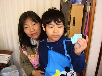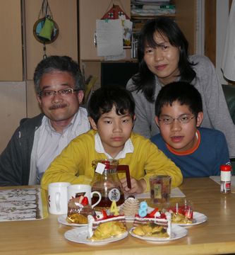 おとうさんは無事に帰ってきました。おとうさんのお誕生日なので記念撮影です(右)。長男は教会の水曜祈祷会に行っていて写真に写っていません。今日は小学校の授業参観がありおかあさんが出かけてきました(右)。国語の教科書にある「三つのおねがい」の文章を上手に朗読して先生にほめていただいた全くんです。