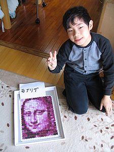 先日の東京出張でおとうさんがおみやげで買ってきたjigazoパズルで、まずモナリザを作ってみた全くん、啓くんです。このパズルのの300ピースを組み替えたらどんな顔でもできると言うことで、今度は啓くんの自画像を作ることにしました。完成したらまた写真を載せます。