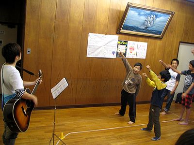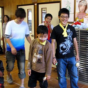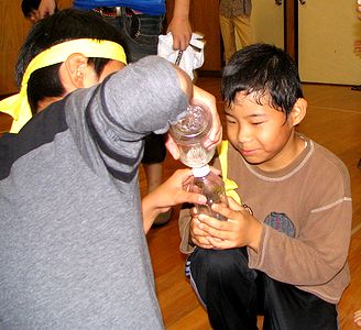今日は教会学校の恒例「ミニ大運動会」でした。振付つきで賛美をして(写真左)、牧師先生のお話を聞きました。それからペットボトルリレー(水のリレー、写真中)やピンポン玉リレーその他いろいろの競技で楽しみました。写真右はパン喰い&(小麦粉の中の)飴だま探し競走をした後での様子です。