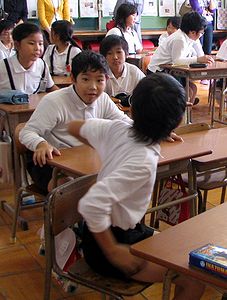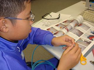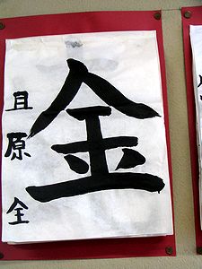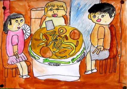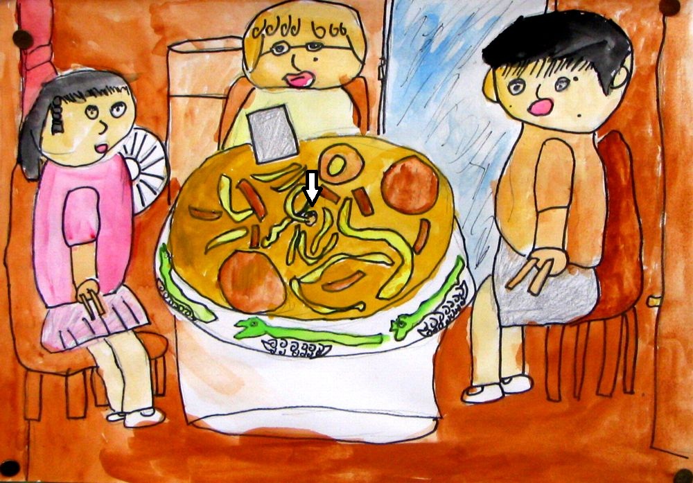 小学校の参観日でした(写真左)。教室には生徒たちの書道作品が飾ってありました。各自、好きな一文字を書く、ということでした。他の子は「義」とか「心」とかあるいは自分の名前の一字を選んでいましたが、全くんの作品は写真中のものでした。本人に聞くと「かね」だそうです。写真右は「気がつくとそこにいた」というテーマで、全くんは夢でみた光景を描きました。お友達の家の食卓で、自分はラーメンになっていたそうです。よく見ると(大きな写真はこちら(156K))本人は確かに麺になっています(大きな写真の矢印の先))。