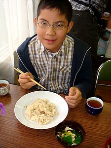 教会ではお昼に国産マツタケご飯とマツタケのお吸い物がでました。教会員の親族にマツタケ山を持っている方がいて、今年は報道のようにマツタケが豊作でそのおすそわけをいただいたのです。写真左上はおいしそうにいただいている啓くんです。