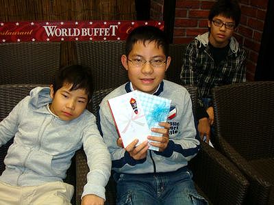 今日は啓くん13歳の誕生日です。ここまで守られて神さまに感謝です!本人も夜のお祈りでちゃんとそのようにお祈りしていました。お祝いの食事は本人の希望でワールドビュッフェでバイキングディナーになりました。お店の待ち時間に誕生日プレゼントの本とおばあちゃんからの金一封をもらって記念撮影です。