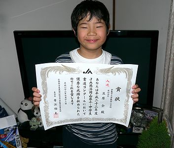 小学校で書いた習字がコンクールで入選して賞状と副賞(クリアファイルとクレヨン)をもらって帰った全くんです。ちょっとだけ自慢です。